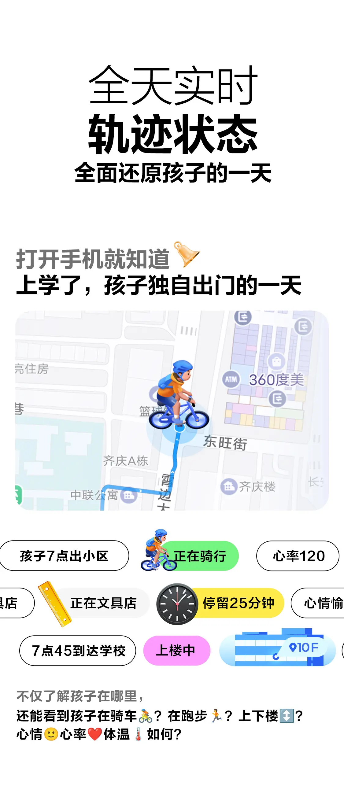 - 家长安全焦虑:通过楼层定位、心率监测等功能构建基础信任