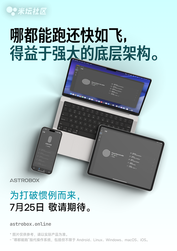 运行 AstroBox 的设备端暂不支持 iOS、iPadOS ;这些设备中的部分设备将在未来提供支持